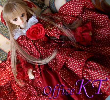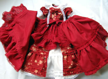 赤薔薇柄の被せ3段ワンピースと赤と白のペチコート、ストール、サロンエプロン等単品を
